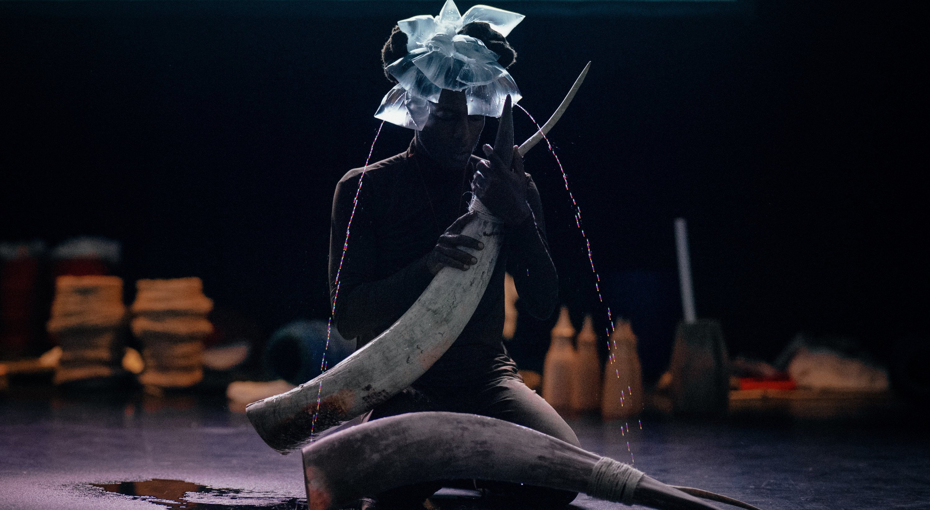 Born in western Rwanda in the early 1990s, Cedric Mizero is a self-taught artist whose composite practice blends visual arts, fashion, and performance art. UMUNYANA evokes a world in suspension, traversed by a character suffering from a memory disorder, which leads him into a universe where the Inka, the cow, is mourned, sung and embodied. A much-venerated goddess who is now unheard of, she reappears in the form of a luminous spectrum that bodies try to resurrect through gesture, breath and song. Influenced by his research on the slaughter of animals on market days, a practice that contrasts sharply with Rwanda's cultural respect for cows, Cedric Mizero’s installation is built in the form of a fragmented vision. Images emerge from one room to the next, taking us on an exploration of livestock history and culture in Rwanda. UMUNYANA sings of the loss of a rural world which is fading away, and celebrates the invisible links that unite humans to animals, to the past and to the land.